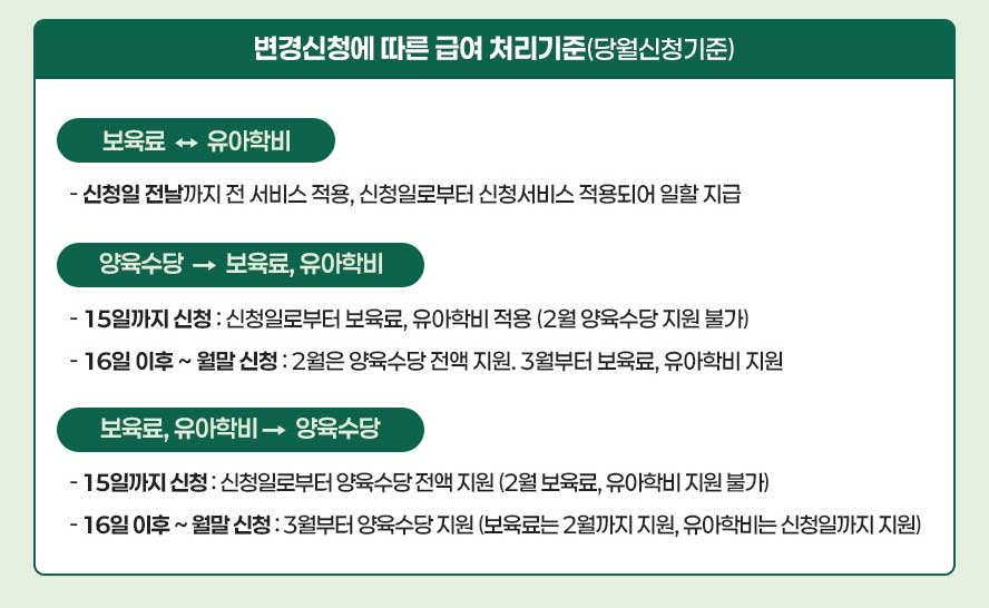 - 가정양육 → 어린이집/유치원: 3월부터 어린이집에 가거나 유치원에 처음 입학하는 경우 각각 보육료나 유아학비로 사전신청을 해야 합니다.